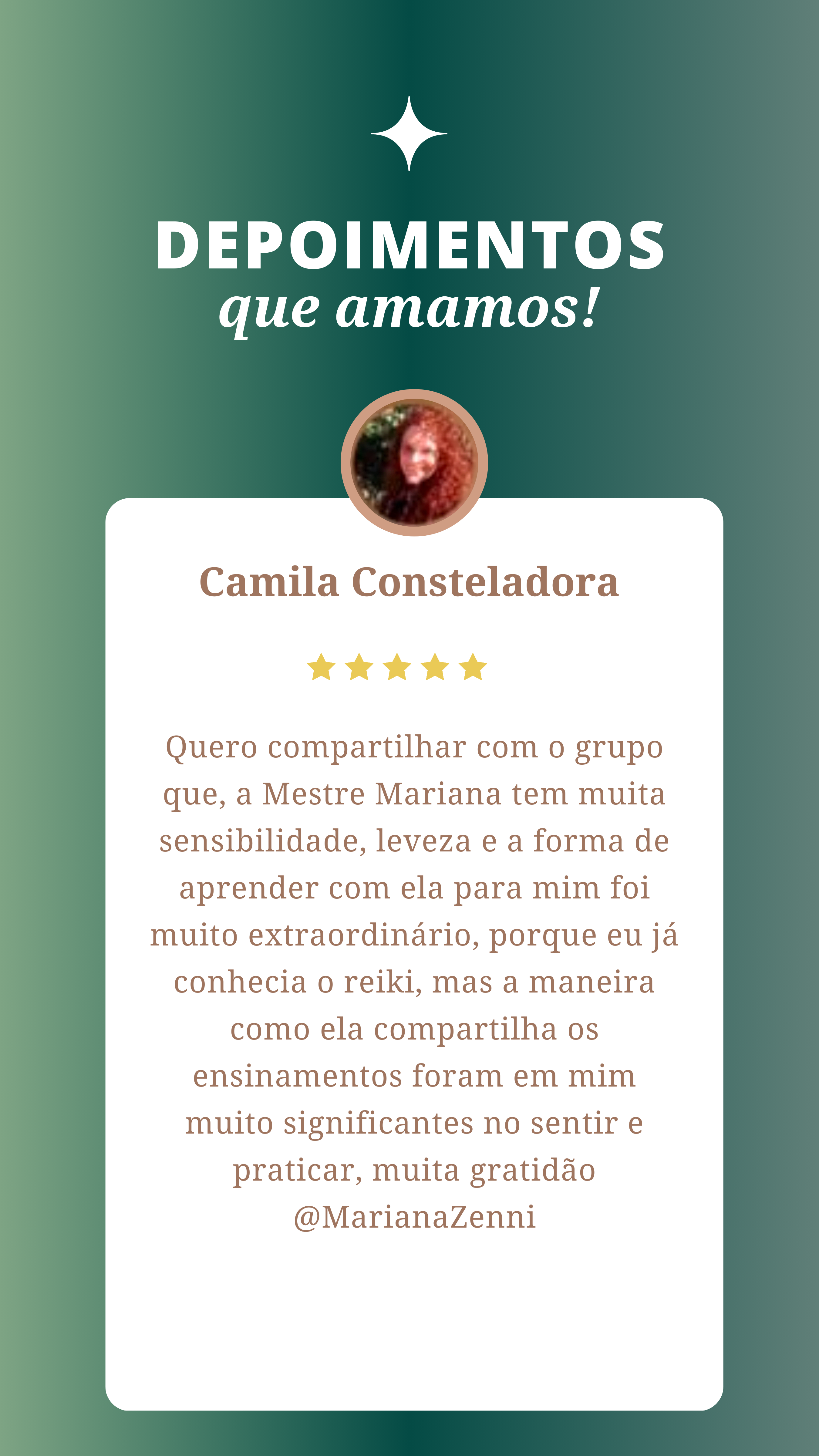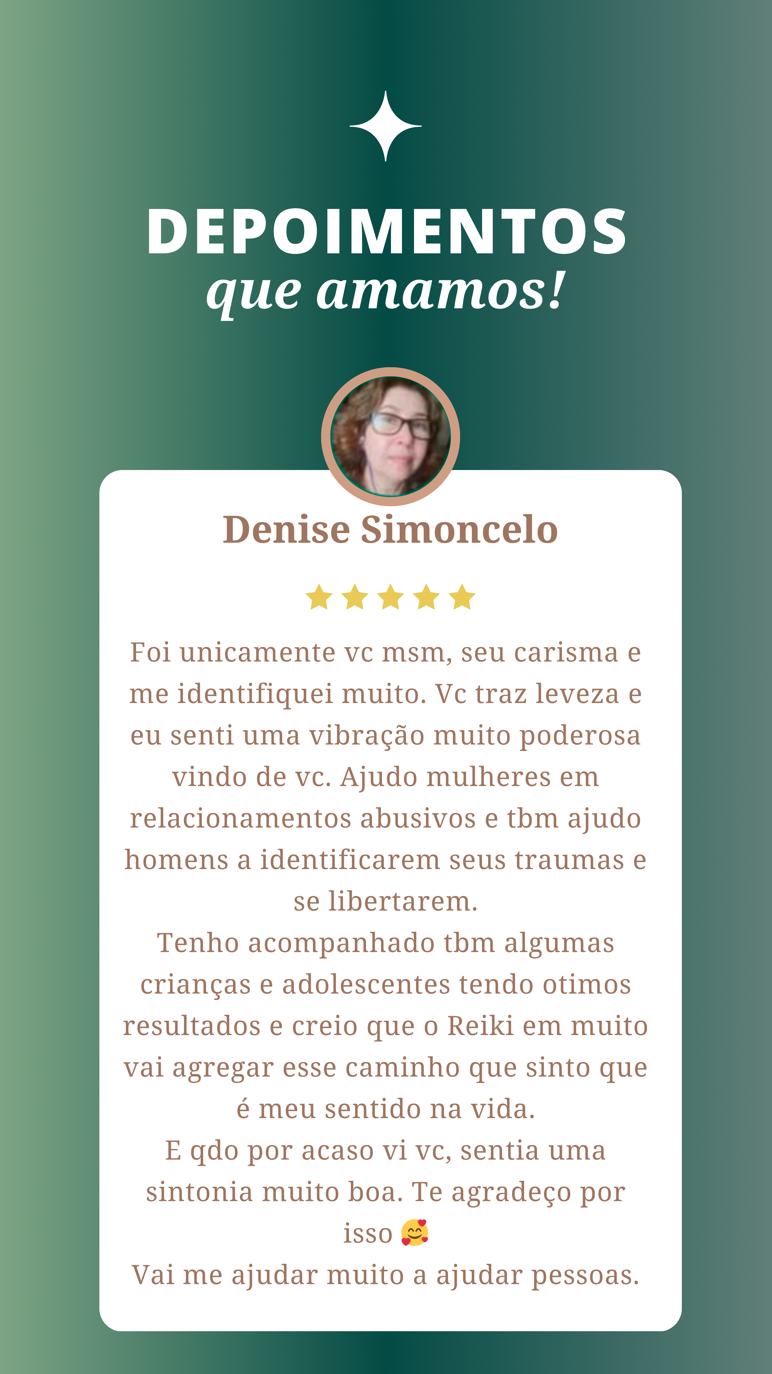 Esther começou sua jornada holística com o Reiki, aplicava presencialmente nas casas das clientes com uma maca portátil, após a pandemia ela sentiu a necessidade de estudar mais e avançar em outras áreas, se tornando Consteladora Familiar. Esther até hoje ainda utiliza o Reiki diariamente nas suas praticas em casa e na sua família, ela é grata por esse caminho lindo que a levou a esse profundo despertar.